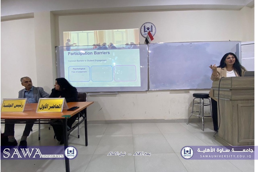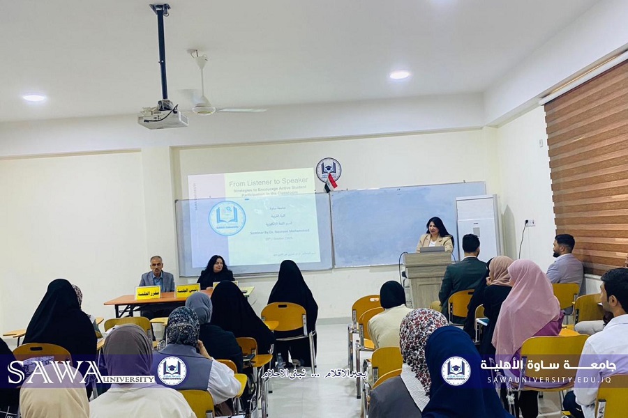 From Listener to Speaker: Strategies to Encourage Active Student Participation in the Classroom ، وعنوانها باللغة العربية ( من " مستمع" إلى " متحدث" : ستراتيجيات تشجيع المشاركة الفعالة للطلبة في الصف)، وذلك في تمام الساعة الثانية عشرة من ظهر يوم الاثنين الموافق 27 / 10 / 2025، شارك فيها: