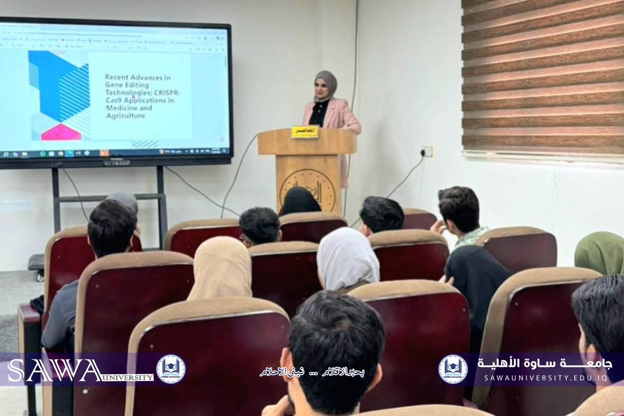 استعرضت الندوة أحدث التطورات في تقنية CRISPR-Cas المستخدمة لتحرير الجينات بدقة عالية، وشرح مبدأ عمل التقنية المعتمد على إنزيم Cas9 والـ gRNA لتعديل الحمض النووي، وتطرقت الى أهم التطبيقات الطبية مثل علاج الأمراض الوراثية، تطوير علاجات مناعية للسرطان، ومكافحة الفيروسات. كما تناولت تطبيقات زراعية مهمة تشمل تحسين المحاصيل، زيادة مقاومتها للجفاف والأمراض، وتحسين صفات الثروة الحيوانية، وأكدت على ضرورة الالتزام بالضوابط الأخلاقية والتنظيمية لتجنب المخاطر المرتبطة بتعديل الجينات، وضمان الاستخدام الآمن للتقنية.