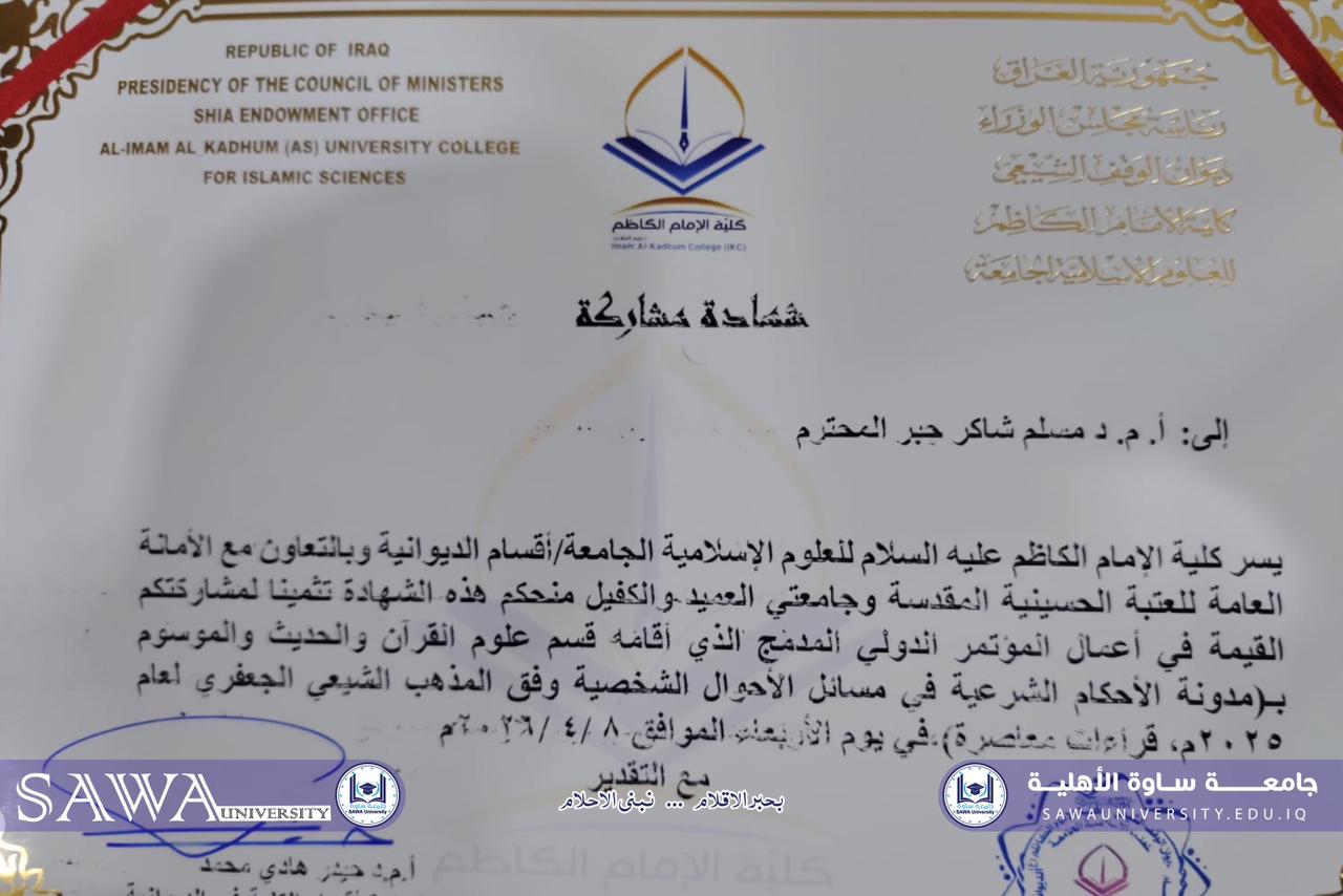 مشاركة وتكريم في مؤتمر علمي بكلية الإمام الكاظم (عليه السلام) – أقسام الديوانية