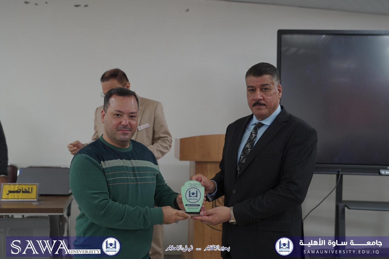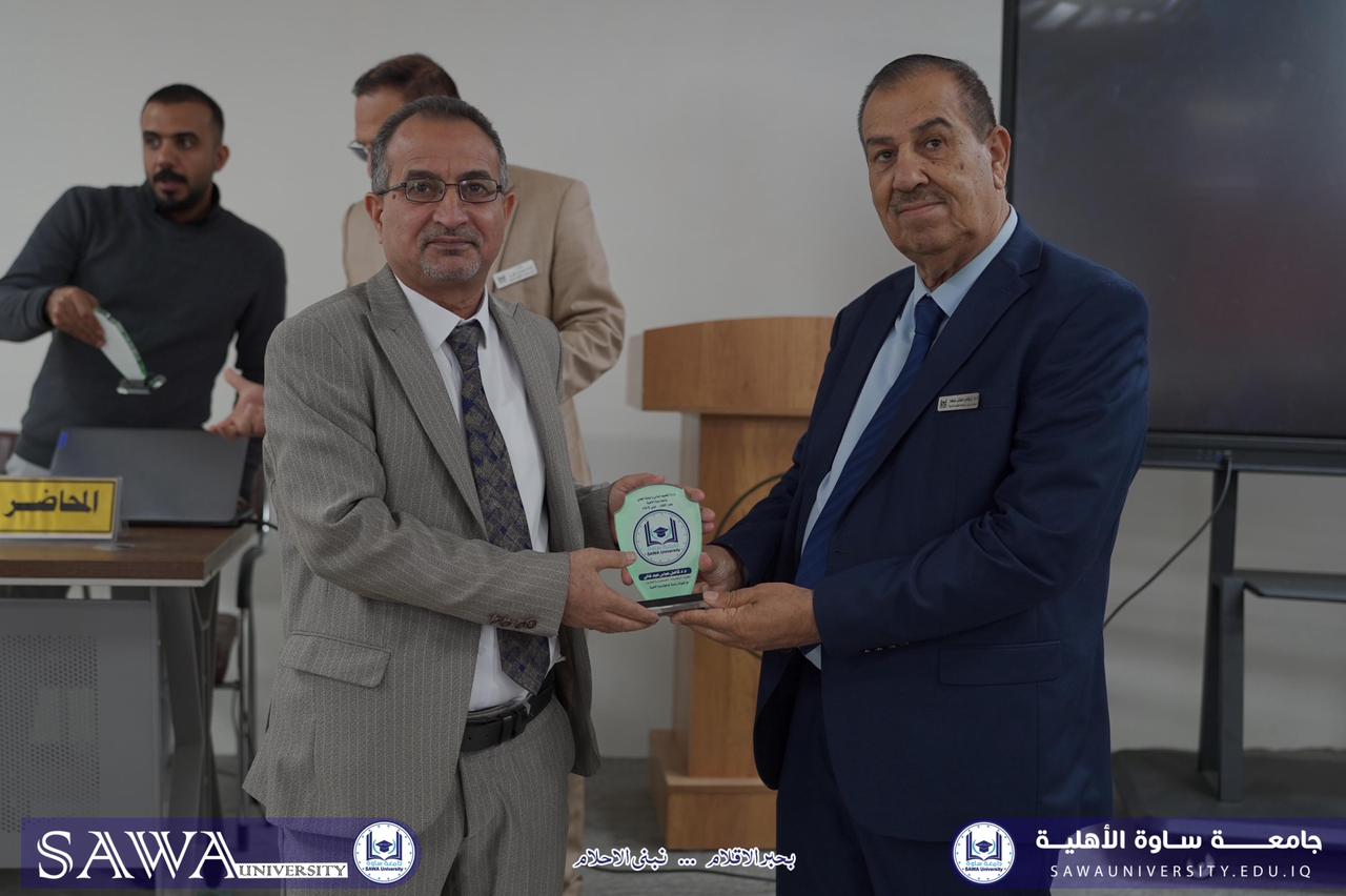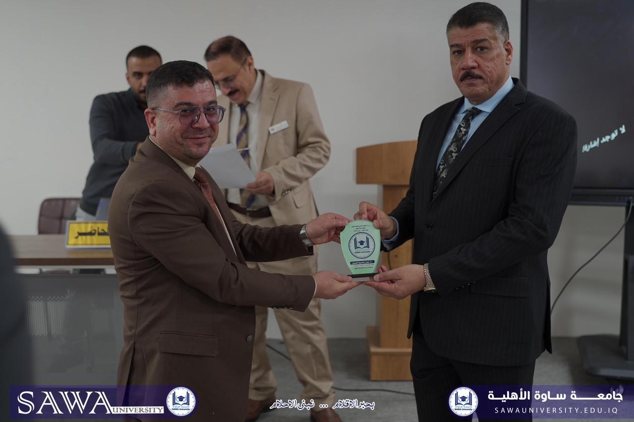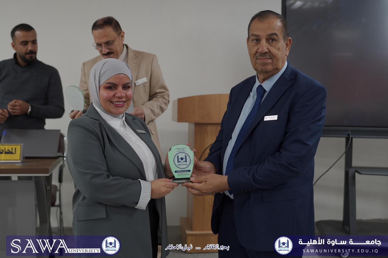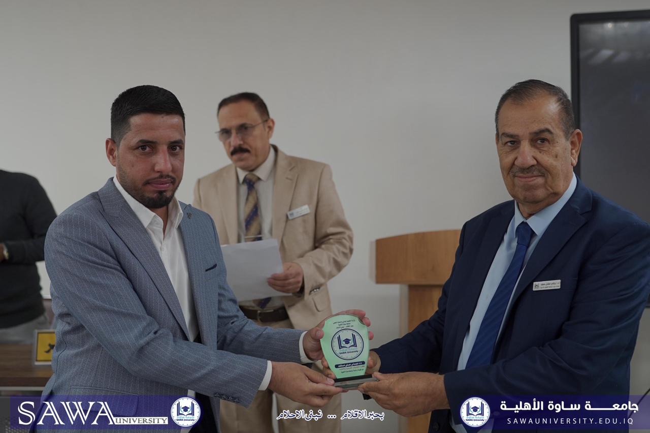 ووزع هدايا التكريم السيد مساعد رئيس الجامعة للشؤون الإدارية الأستاذ الدكتور تركي مفتن العارضي، والسيد مساعد رئيس الجامعة للشؤون العلمية الأستاذ المساعد الدكتور صفاء مصطفى الجنابي، والسيد عميد الكلية الأستاذ المساعد الدكتور حسن رحيم خضر، مشيدين بجهودهم المتميزة وإبداعهم الأكاديمي الذي كان له الأثر المباشر في رفع مستوى التعليم وضمان جودة العملية التعليمية في الجامعة