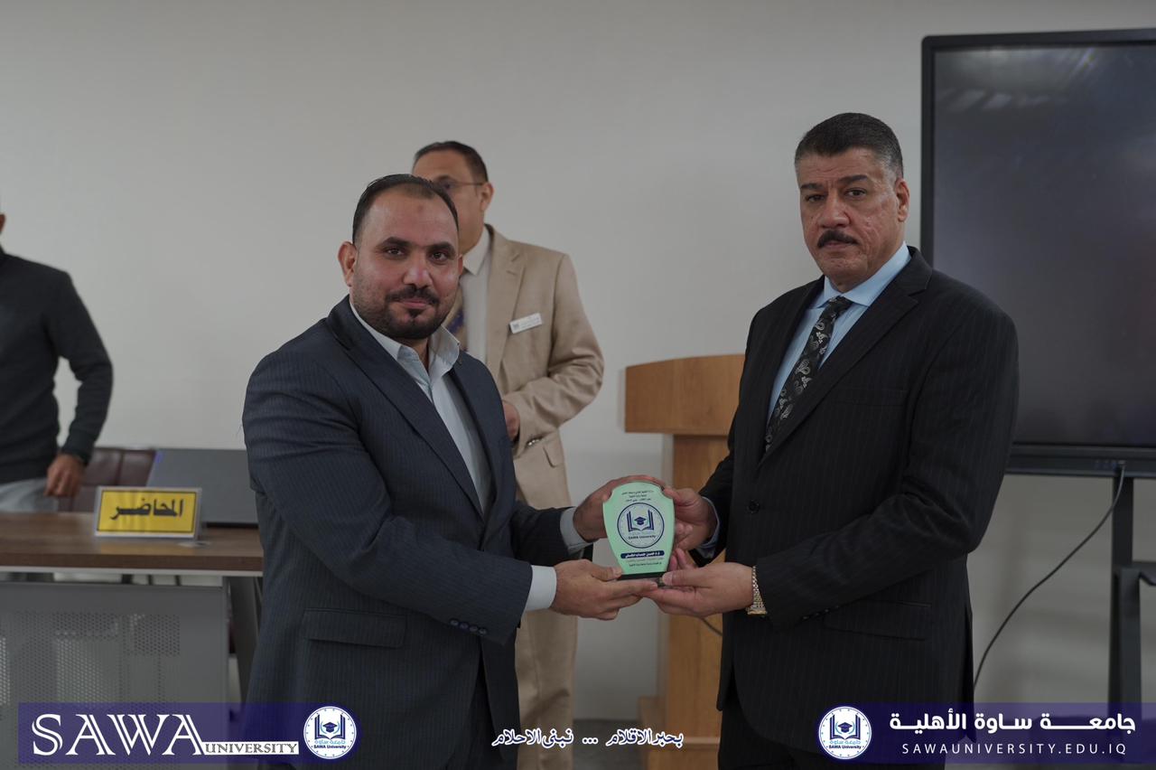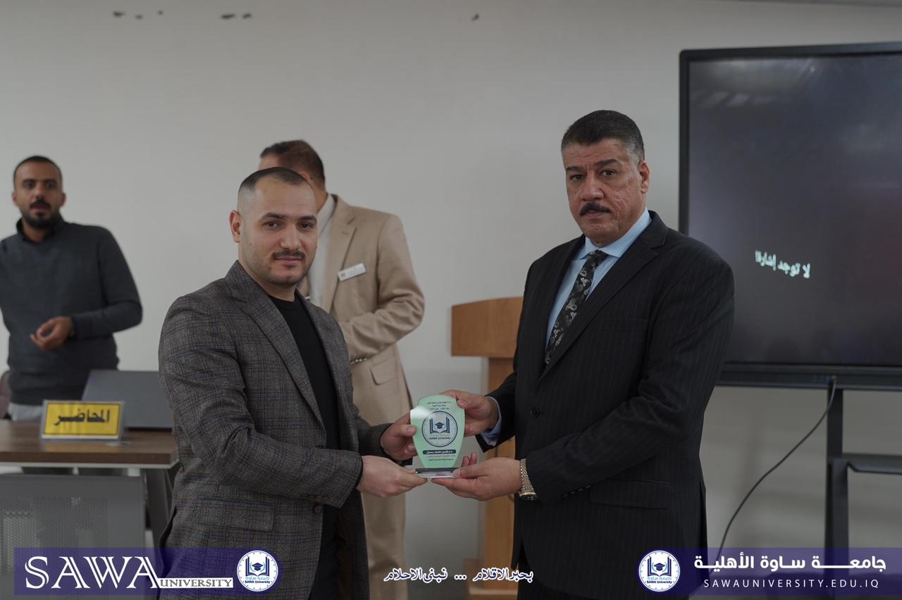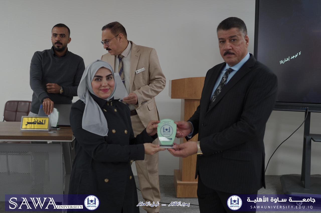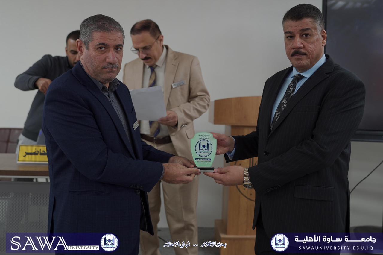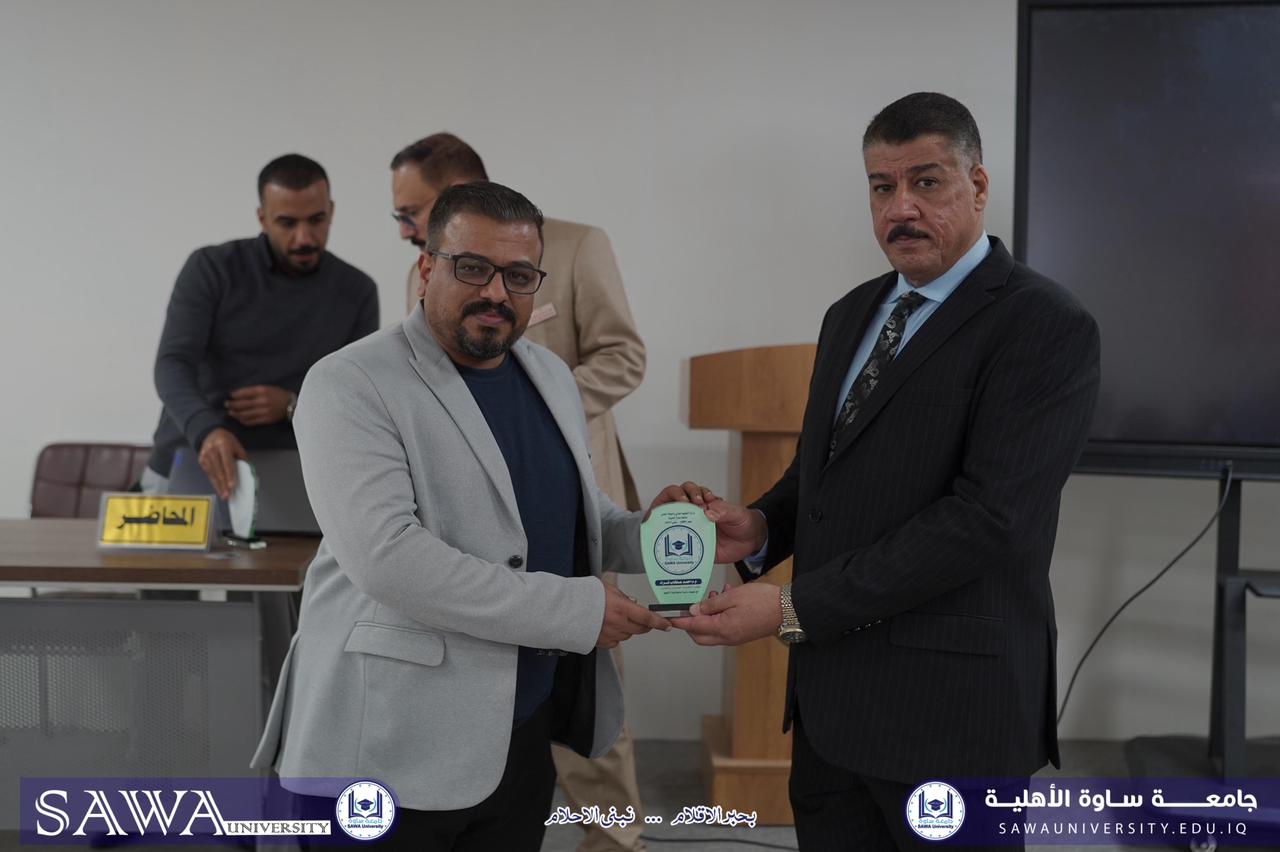 ووزع هدايا التكريم السيد مساعد رئيس الجامعة للشؤون الإدارية الأستاذ الدكتور تركي مفتن العارضي، والسيد مساعد رئيس الجامعة للشؤون العلمية الأستاذ المساعد الدكتور صفاء مصطفى الجنابي، والسيد عميد الكلية الأستاذ المساعد الدكتور حسن رحيم خضر، مشيدين بجهودهم المتميزة وإبداعهم الأكاديمي الذي كان له الأثر المباشر في رفع مستوى التعليم وضمان جودة العملية التعليمية في الجامعة