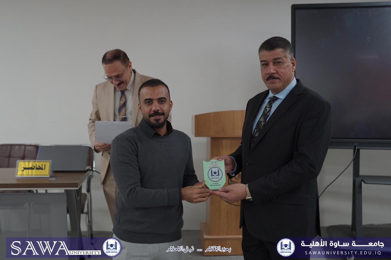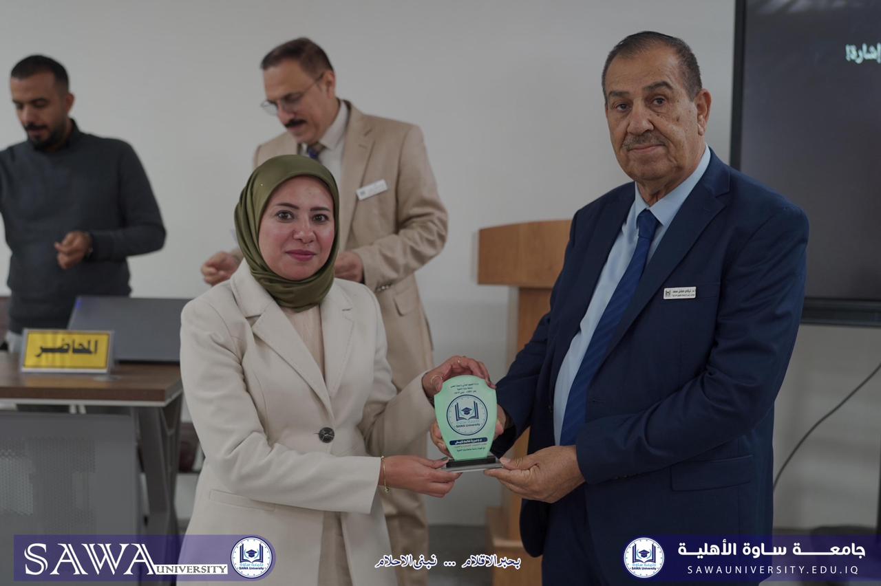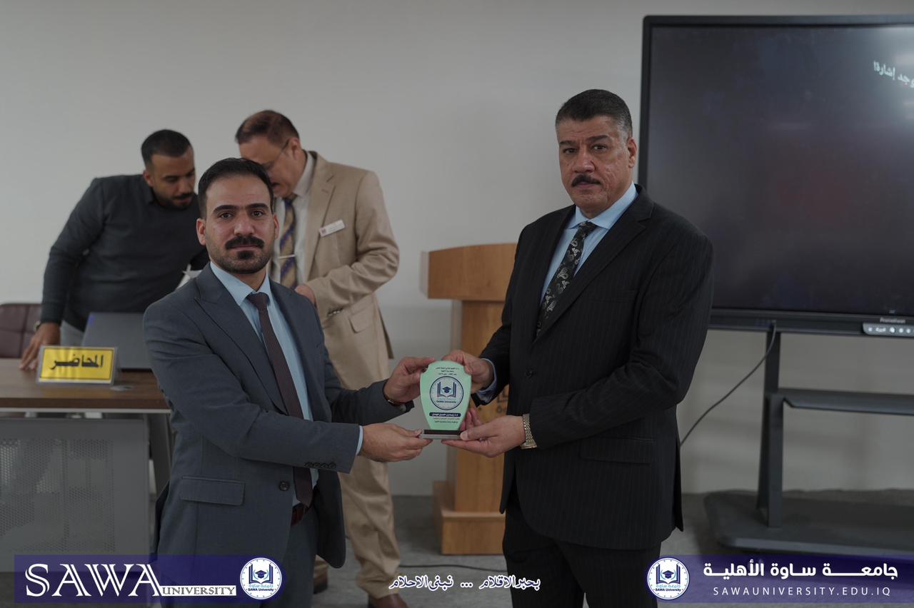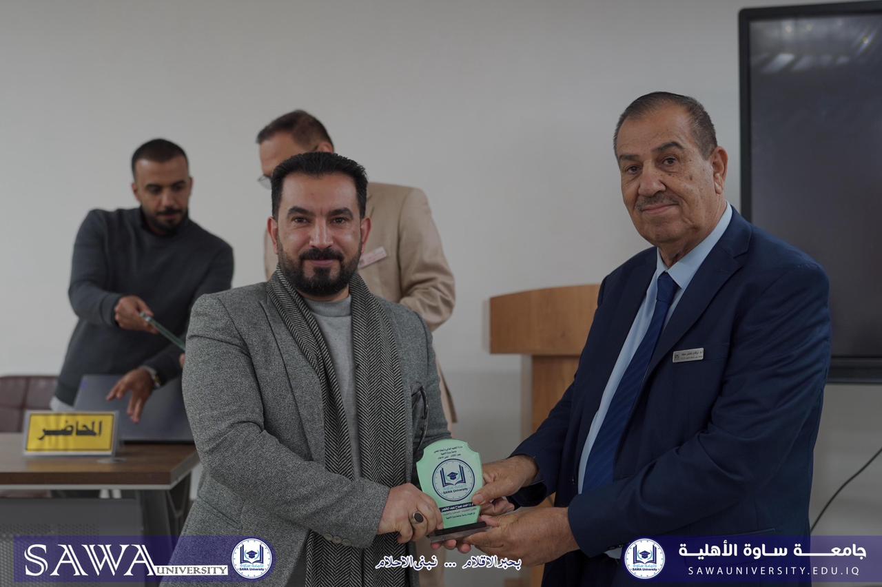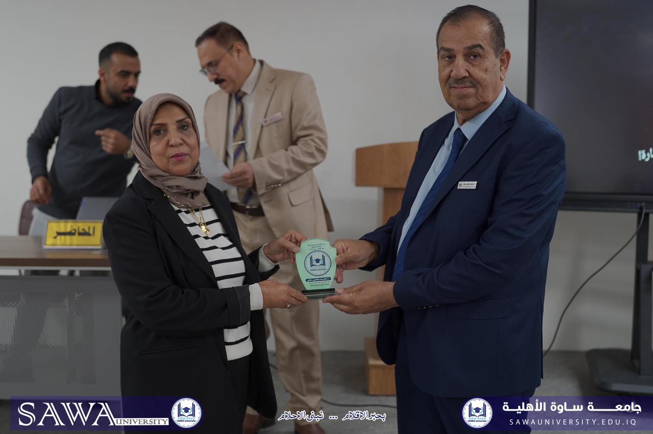 ووزع هدايا التكريم السيد مساعد رئيس الجامعة للشؤون الإدارية الأستاذ الدكتور تركي مفتن العارضي، والسيد مساعد رئيس الجامعة للشؤون العلمية الأستاذ المساعد الدكتور صفاء مصطفى الجنابي، والسيد عميد الكلية الأستاذ المساعد الدكتور حسن رحيم خضر، مشيدين بجهودهم المتميزة وإبداعهم الأكاديمي الذي كان له الأثر المباشر في رفع مستوى التعليم وضمان جودة العملية التعليمية في الجامعة