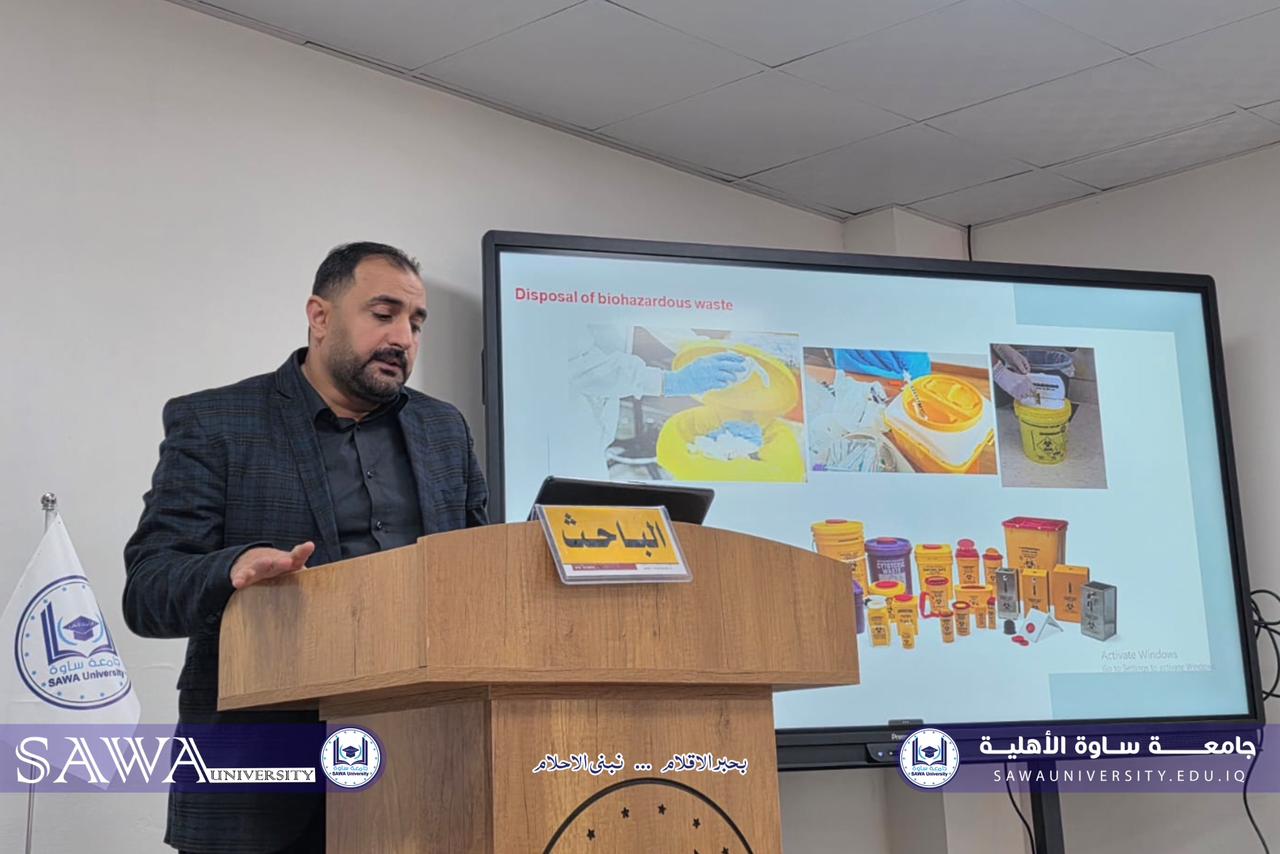 برعاية لسيد رئيس مجلس الادارة الدكتور مضر عبد الله الظالمي المحترم والسيد رئيس جامعة ساوة الأهلية الاستاذ الدكتور عقيل سرحان المحترم والسيد عميد كلية التقنيات الصحية والطبية أ.م.د حسن رحيم خضر المحترم اقامت كلية التقنيات الصحية والطبية قسم تقنيات المختبرات الطبية ورشة علمية حول السلامه المختبريه اثناء استخدام الاجهزه المختبرية